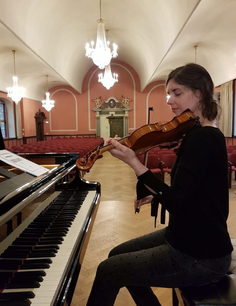 Her repertoire includes the major violin sonatas by Mozart, Beethoven, Schubert, Brahms, Mendelssohn, Grieg, Franck, Debussy, Ravel, and Prokofiev, complemented by 20th-century works such as Lutosławski and virtuoso pieces by Wieniawski, Szymanowski, Sarasate, and Saint-Saëns. As a soloist with orchestra, she has performed, among others, Paganini’s Second Violin Concerto at the Bremen Concert Hall “Die Glocke.”