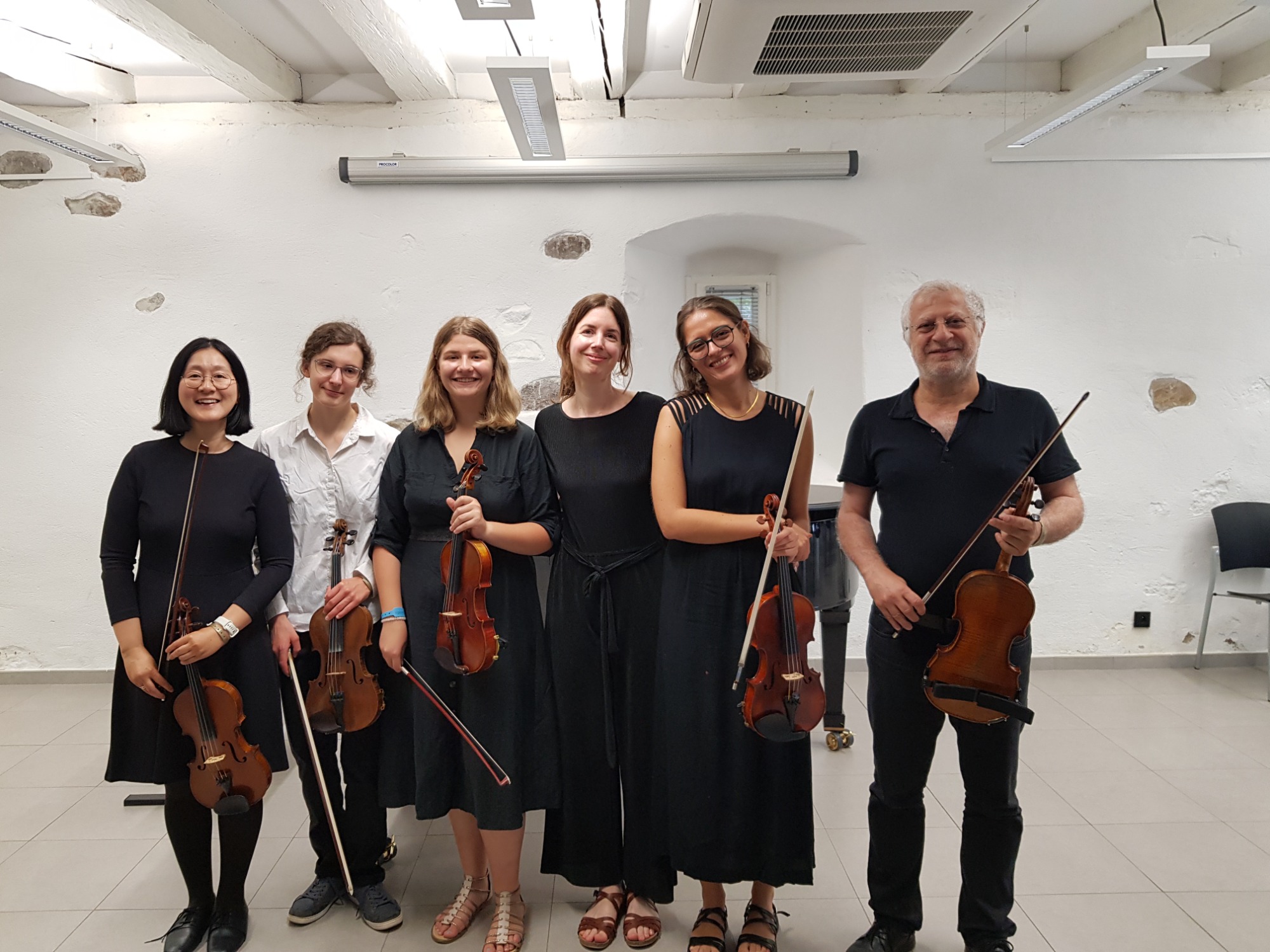 "Ausgesprochen klangschön musiziert das Ensemble unter seiner Primaria Katharina Cording, die mit ihrer natürlich wirkenden Musikalität, ihrem atmenden Spiel und ihrem entspannten Lächeln bezaubert." The ensemble performs with an exceptionally beautiful sound under its primaria Katharina Cording, who captivates with her naturally expressive musicianship, her breathing style of playing, and her relaxed smile.